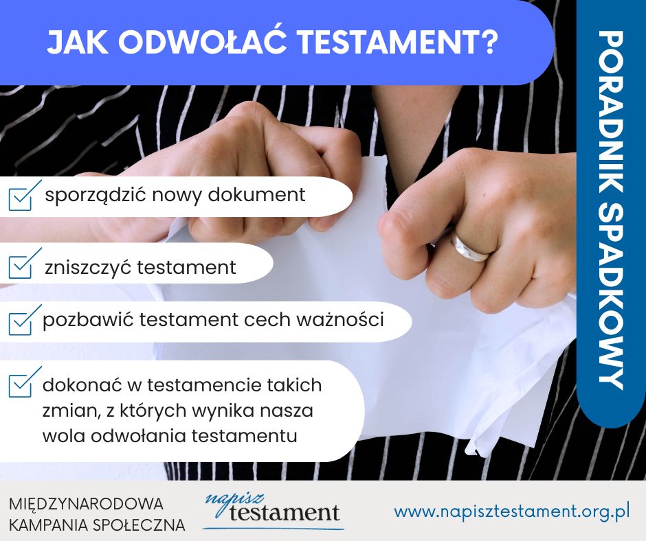 Co robić, gdy chcesz odwołać testament, który już napisałeś? Jest kilka prostych sposobów, które wskazujemy na infografice. Zanim odwołasz testament warto jeszcze wiedzieć, że… nowy