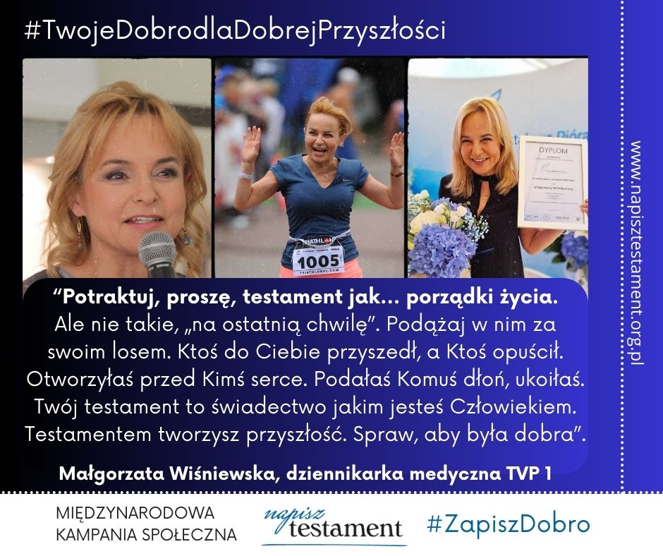 Małgorzata Wiśniewska jest także Bohaterką ogólnopolskiej kampanii społecznej Napisz Testament – Zapisz Dobro – #TwojeDobrodlaDobrejPrzyszłości – której celem jest zachęcanie do sporządzania testamentów, jako dokumentów regulujących kwestie majątkowe na każdym etapie życia oraz uwzględniania w testamentach transparentnych organizacji pozarządowych realizujących bliskie każdej osobie cele społeczne dla #dobrejprzyszłości.